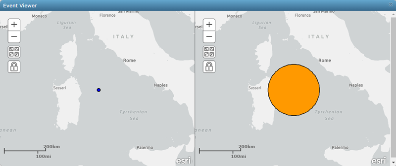 Event Viewer opens a viewer for each selected route. This can be useful to validate geometry changes when performing event processing. For example, original point geometry from a GeoEvent can be visualized in the first viewer while the same GeoEvent emitted from a Buffer Creator Processor, for example, can be visualized in the second viewer. This allows you to confirm the original point geometry was buffered successfully and is now a polygon. Use the lock widget to synchronise each of the viewers and ensure you are looking at the same geographic area for geometric changes.