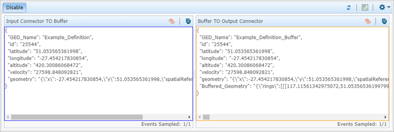 可以同时在两条路径上执行 GeoEvent 采样。 对两条路径进行采样对于比较和验证相关实时数据的变化会很有用。 例如,由缓冲区创建者处理器发出的 GeoEvent 可以与其原始源几何(点)具有不同的几何(面)。 通过从往返于处理器的路径中采样 GeoEvent,您可以确认 GeoEvent 不仅被缓冲区创建者处理器接收,而且它们会被处理器缓冲。