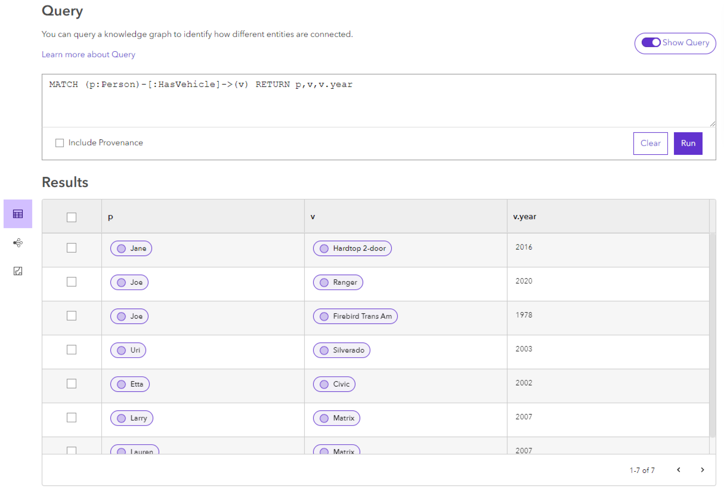 相反,如果查询返回实体或关系的特定属性,则结果列表将在每列中显示这些值。 例如,诸如 MATCH (p:Person)-[:HasVehicle]->(v) RETURN p,v,v.year 之类的查询将返回 p 列中 Person 实体的显示名称、v 列中 Vehicle 实体的显示名称,以及 v.year 列中 Vehicle 实体的年份属性值。 如果实体没有查询所返回的特定属性的值,您将看到 (NULL) 作为没有值可显示的事实的表示。